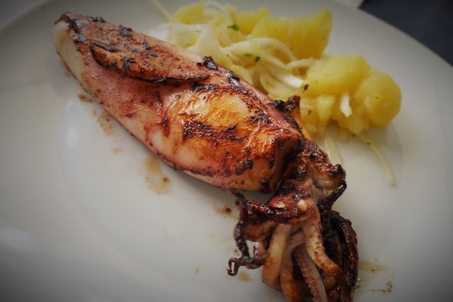 お昼は、裏路地の石畳のテラス席での食事です。メニューはイカのグリル。私たち団体が到着してから、イカが焼かれ始めているのが見えました!うーん、いい香り!!!