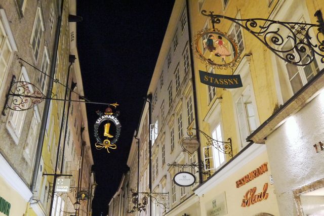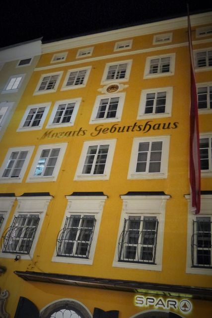 ゲトライデガッセと呼ばれる伝統的な鉄細工の看板が独特の雰囲気を醸し出す小路の途中に、モーツァルト生家がありました。