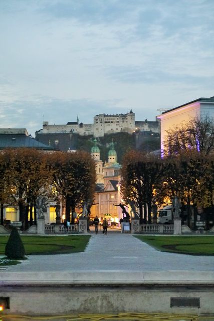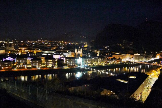 ザルツァッハ川にかかるマカルト橋には、南京錠がいっぱい! Parisのセーヌ川のポンデザールのように崩壊するほどではありませんが。背景にホーエンザルツブルク城が見えます。空がネイビーに染まるころ、夕暮れ時の写真が撮れました。それにしても、ものすごいシンプルなデザインの橋ですね。お城とミスマッチなのでしょうが、シンプルなので、逆に気にならないような。