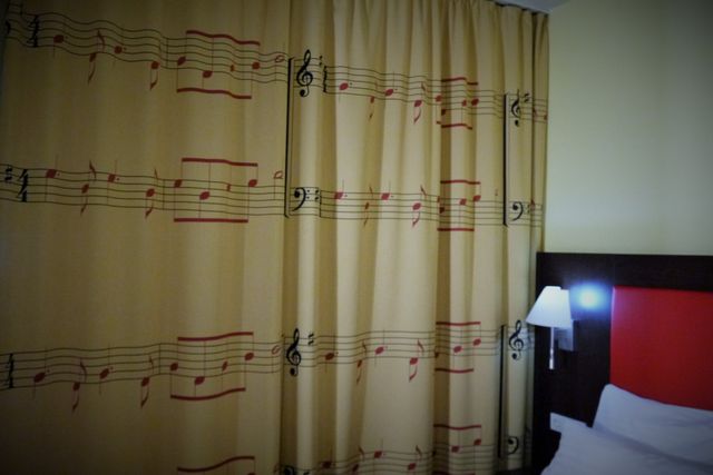 本日のオーストリアのホテルは、デザイナーズホテルのような感じでした。シンプルな作りでしたが、カーテンが楽譜!