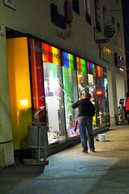 サウンドオブミュージックのドレミの歌が歌われた「ミラベル庭園」、モーツアルトの青年時代育った家の前を通り、さっそく窓掃除発見です!夕刻にするとは、クローズ作業でしょうか。