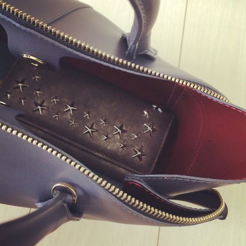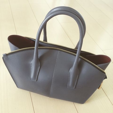 イタリアのブランドで、大変軽いレザー。小さ目です。A4までは入りません。グレー好きの私にとって、どの服に合わせてもピッタリきます。内側がREDというところがポイントです。昨年購入したJIMMY CHOOの財布と。