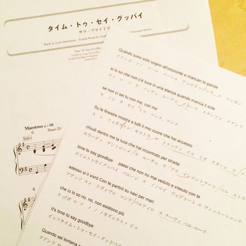 ということで、新曲です! ライブ後の打ち上げで、aiさんに「ひとみさん、『Time to say goodbye』どうですか?」と冗談半分に言われたのですが、それだ!自分にとって全くの想定外!サラ・ブライトマンのコンサートにも行ったことありますし!で、調べてみると、「Time to say goodbye」だけが英語で、あとはイタリア語なんですね。誰もカラオケで歌わないわけだ。(笑)