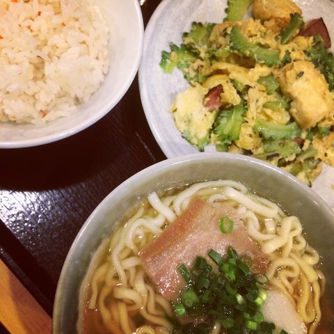 すっかり夕飯の時間となり、ロールキャベツが有名な新宿の「アカシヤ」へ行ったら、ちょうどお休み。その手前で、気になった沖縄料理にしました。沖縄料理屋に一人で入ることなんてまずないですが、ゴーヤチャンプルが急に食べたくなってしまい衝動的に。2階のカウンター席に通されました。