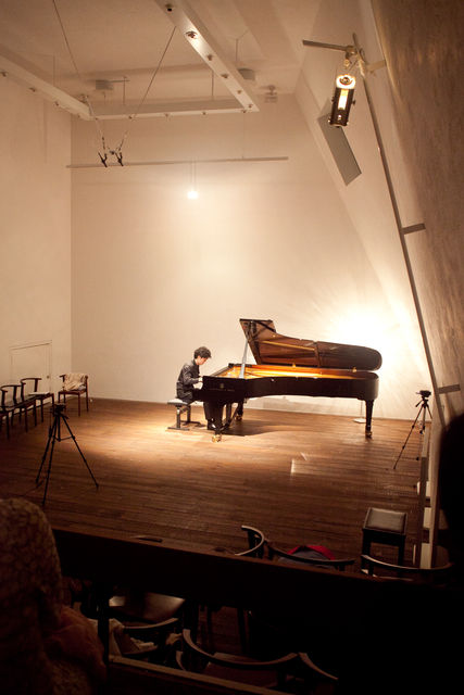 観客は、ロフトのような2階席で鑑賞です。たった15名のためのピアノ演奏会。鑑賞するほうも、制限があって、拍手をしてはいけない、咳をしてはいけない…で、ノイズを一切立ててはいけない。ということで、お客様も大変じゃないですか?! 「ピアノを習ったことのあるひと、習っている人」という制限もありました。