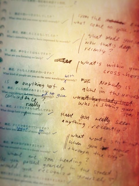 40分で10問の質問が果たして終わるのか? 流れに身を任せて、途中『Lost stars』の発音を確認したくて、歌詞を読んでもらったり、ポンピドゥーセンターの話までして、脱線しまくりだったのですが、それさえも閃きのタネにしていくという、フローがすごいなぁと感動しました。ここで私がしてはいけないことは、「それは違う」と言わないこと。どんなアイデアもすべて受け入れるということですね。そうしないと、40分では終わりませんので。