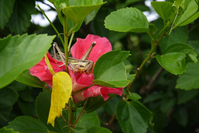 ハイビスカスの写真を撮っていると、バッタがハイビスカスのおしべみたいなものを、モグモグしていました。こんな大きなバッタ見たことないし、ハイビスカスって美味しいの?