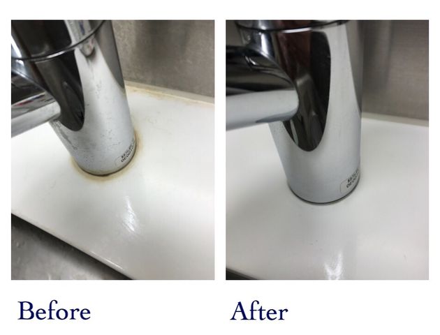 その調子で、お風呂場、洗面台の上も攻略。そして、こちらもずっと悩んでいた、台所の水回りへ。白スポンジや、スコッチブライトで、何度か挑戦していたのですが、落ちなかったところです。どうなるでしょうか?