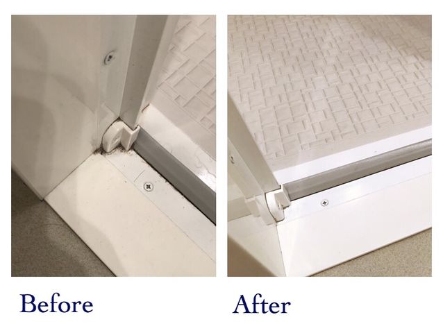 早速、お風呂のドア付近の水垢&カビから試してみることにしました。歯ブラシでゴシゴシ擦ったことはあるのですが、硬くなってしまった水垢、カビには対応出来ず、そのままに。どうなるのかしら???