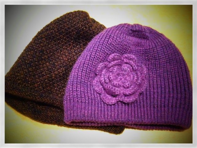 お花アレンジの紫ニット帽です。