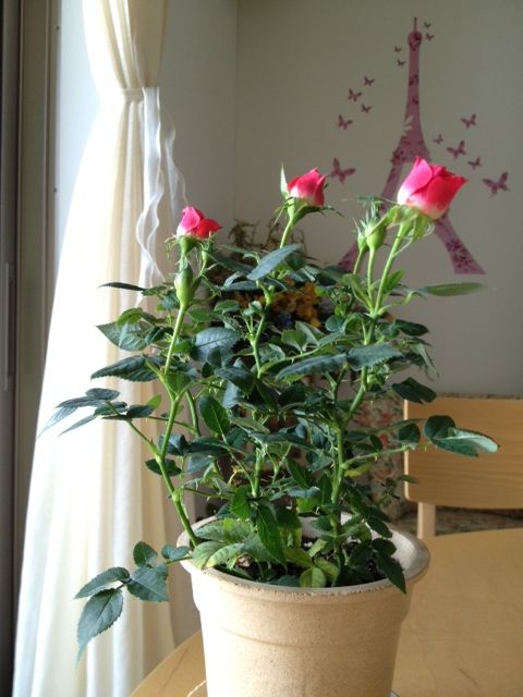 この前のミニバラ、少し咲いてきました。
