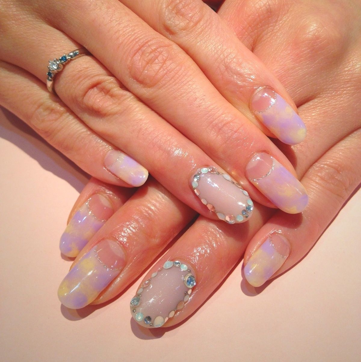ピンクベージュと薄いパープルをマーブリンクした逆フレンチネイルに、