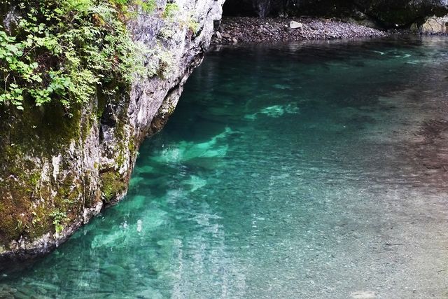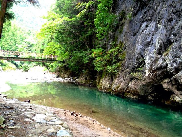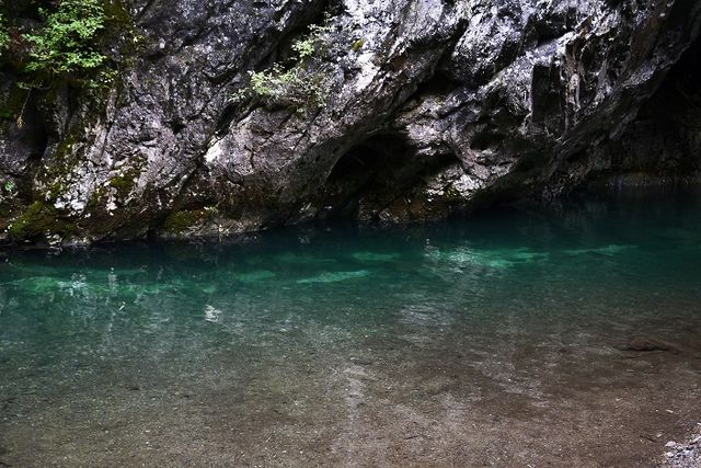 そして、私たちが目にしたものは、エメラルドグリーンの天国のような澄みきった川でした!水の中を悠々と魚が泳いでいました。辺りは静けさが漂い、神秘的な空間でした。それもそのはず、ここは、修行の場でもある蟷螂の窟(こうもりのいわや)の入り口付近です。