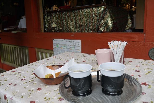 すると、神社の方が、「コーヒーをお入れしますよ。お飲みになっている間、あちらのほうから、パワーが送られてきますので」と。なんで、こんなところにコーヒーミルクと砂糖があるのかな?なんて思っていたので、通りすがりの方に、「いかがですか?」って、いつもしているようです。