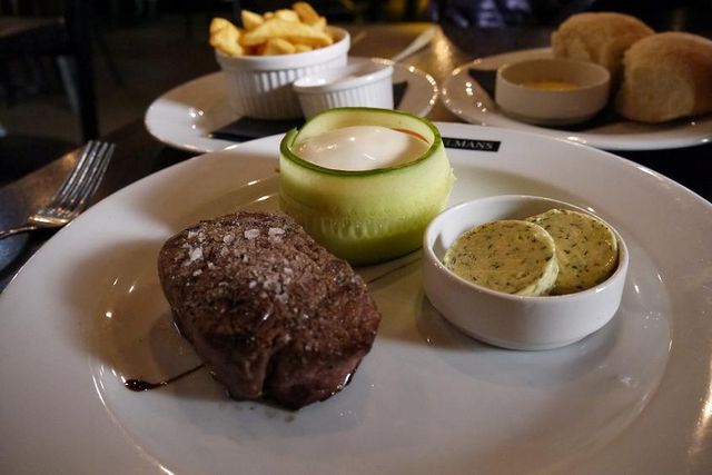 ベルギーステーキをオーダー。厚みのあるステーキで、食べ応えアリました。サラダの盛り付け方も変わっています。きゅうりで囲まれた中にシーザーサラダが入っています。きゅうりは好きではありませんのでよけて。全体的には、パンがおいしい方の印象ばかりが残ってしまいましたが。