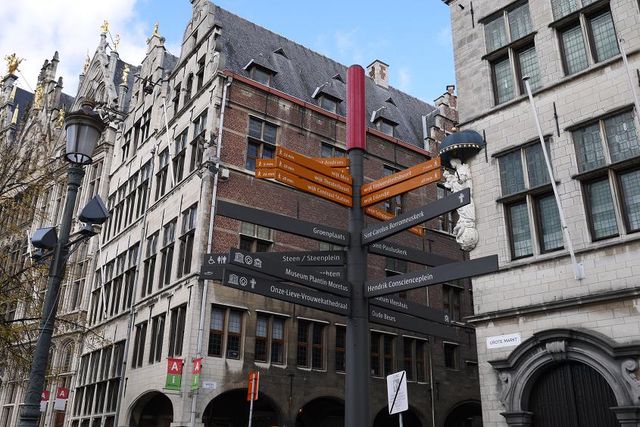 アントワープはみどころたくさんらしく、案内がこんな込入ったことになっていました。このサインが結構使えるなと気づいたのは、アントワープを離れるときです。観光本を見ると、日本語で「大聖堂」とか、そういう記述になっているので、初めからフランス語で、それぞれ周りたい場所を把握しておけばよかったなと。迷いそうな所に、この案内が上手に立っているので、これを利用するべきでした。