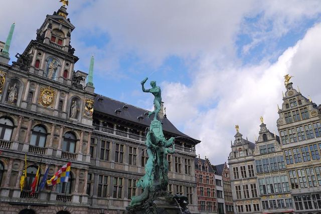 食べ歩きしながら、だんだんとグルン広場に入り、ルーベンスの像と大聖堂が見えてきました!写真を撮ろうとするとき、快晴に近いタイミングに恵まれる、今回の旅行です。