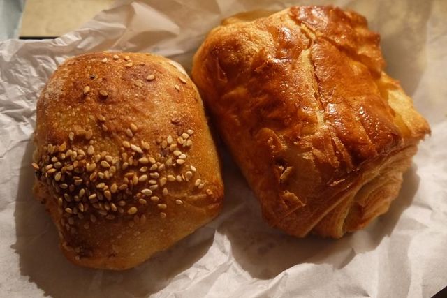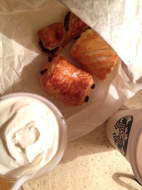 朝、スタバでカフェラテを買い、その帰りに道を歩いていると、もうひとつのパン屋さんも見つけたので入ってみることにしました。プチチョコクロを発見!そのほか2種類のプチなパンとプレーンのフロマージュ(ヨーグルト)が、シンプルな透明の容器にフレッシュにふんわりと入っているのですから、「シルブプレ」と思わず言ってしまった勢いです。