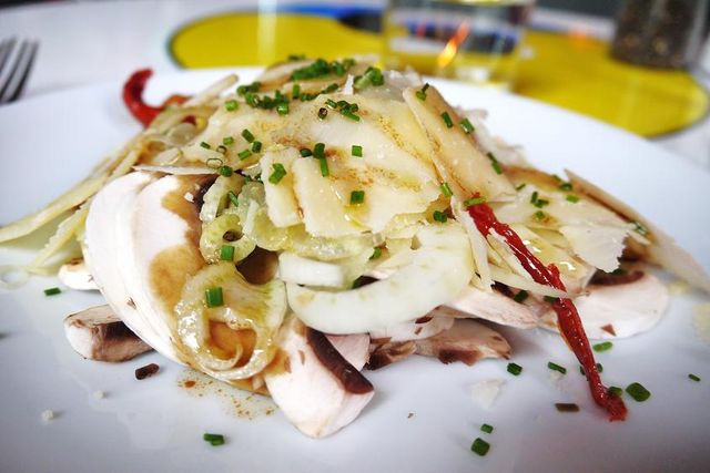 早速、パンがきました。前菜は、マッシュルームとチーズのサラダです。サラダとして食べるマッシュルームには、水分がなくて、パサパサッとした感じですが、そこにチーズが加わると、絶妙な感じでした。