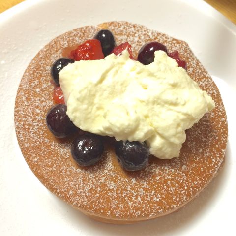 中にバナナを入れて焼いたパンケーキの上にベリーと生クリームをのせてみました。