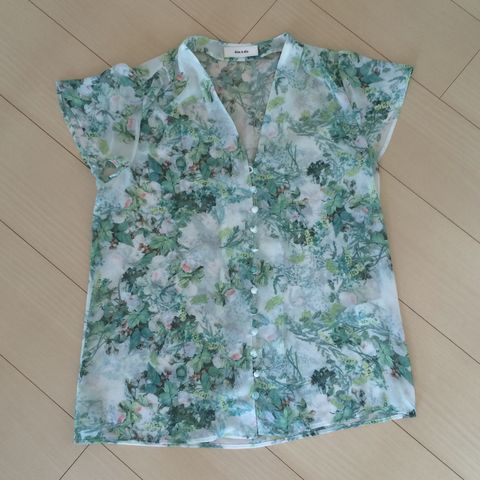 植物柄フレンチスリーブブラウス。