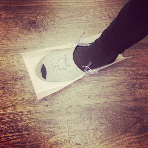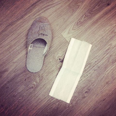 旅の途中~掃除編。 2014.10.23 22:17 寮生活4日目。そろそろ掃除をしたくなってきました。MUJIのフロワーワイパーを一応3枚持ってきたのです。 通常、ハンドルをつけますが、荷物になるためおいてきたので、スリッパに装着して、片足スケートで行いました。 簡単にお掃除完了です。