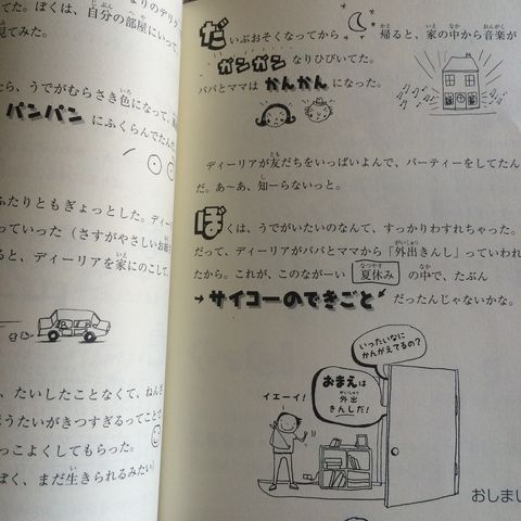 「これね、小学生が読むからちょっとまだ難しいかもしれないけど…」と言ったら、「読んで!読んだらわかる」とゆめちゃんは言いました。今までは、物語やマンガなどの世界には触れたことがあったと思いますが、「エッセイ」のようなものに触れるのは、きっと初めてだと思います。しかし、すべてのページにイラストが書いてあるので、理解の助けとなりそうです。