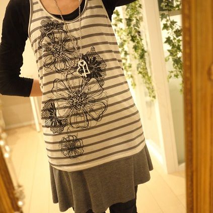 グリーンの印象派の絵みたいな柄のチュニックワンピ。
