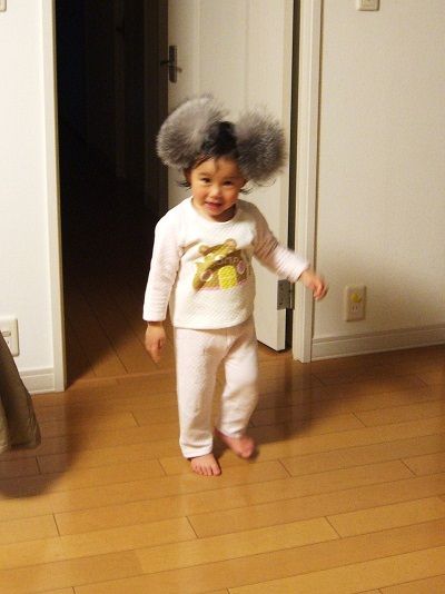 例の耳あてをお風呂上がりのゆめかちゃんに着けてもらいました。