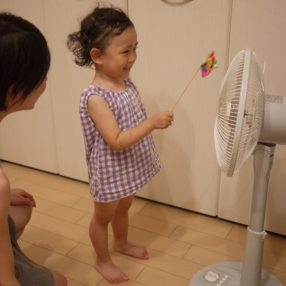 真剣になって、風車を扇風機でなびく位置にセットしていました。