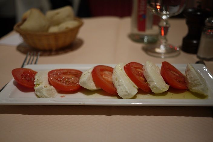 ディナーのセットを注文しました。前菜とメイン、デザートを自分で選ぶ形式です。自分のわかる単語のものを注文。「モッツァレラチーズ」、「リゾット」、「クレームブリュレ」です。ここでもワインを聞かれましたが、ヴィテルで。