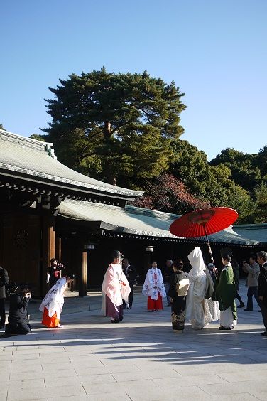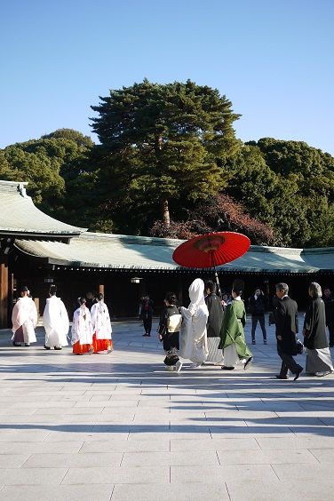 抜けるような青空の下、白無垢に赤い傘が、日本らしい色の配色。