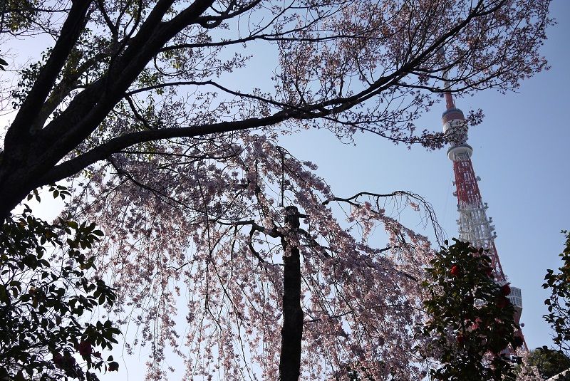 「東京タワーとしだれ桜と椿」。