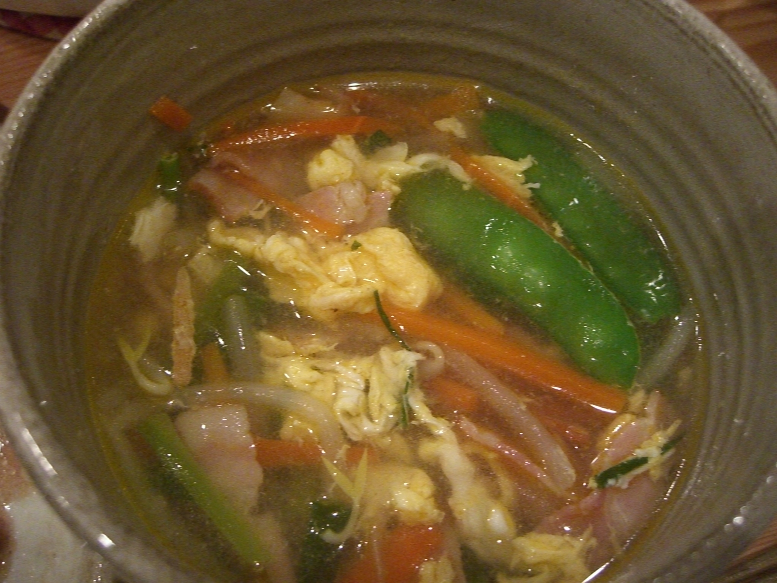 お湯にトリガラスープ1まわしをさらさら入れて、コショウを適量。