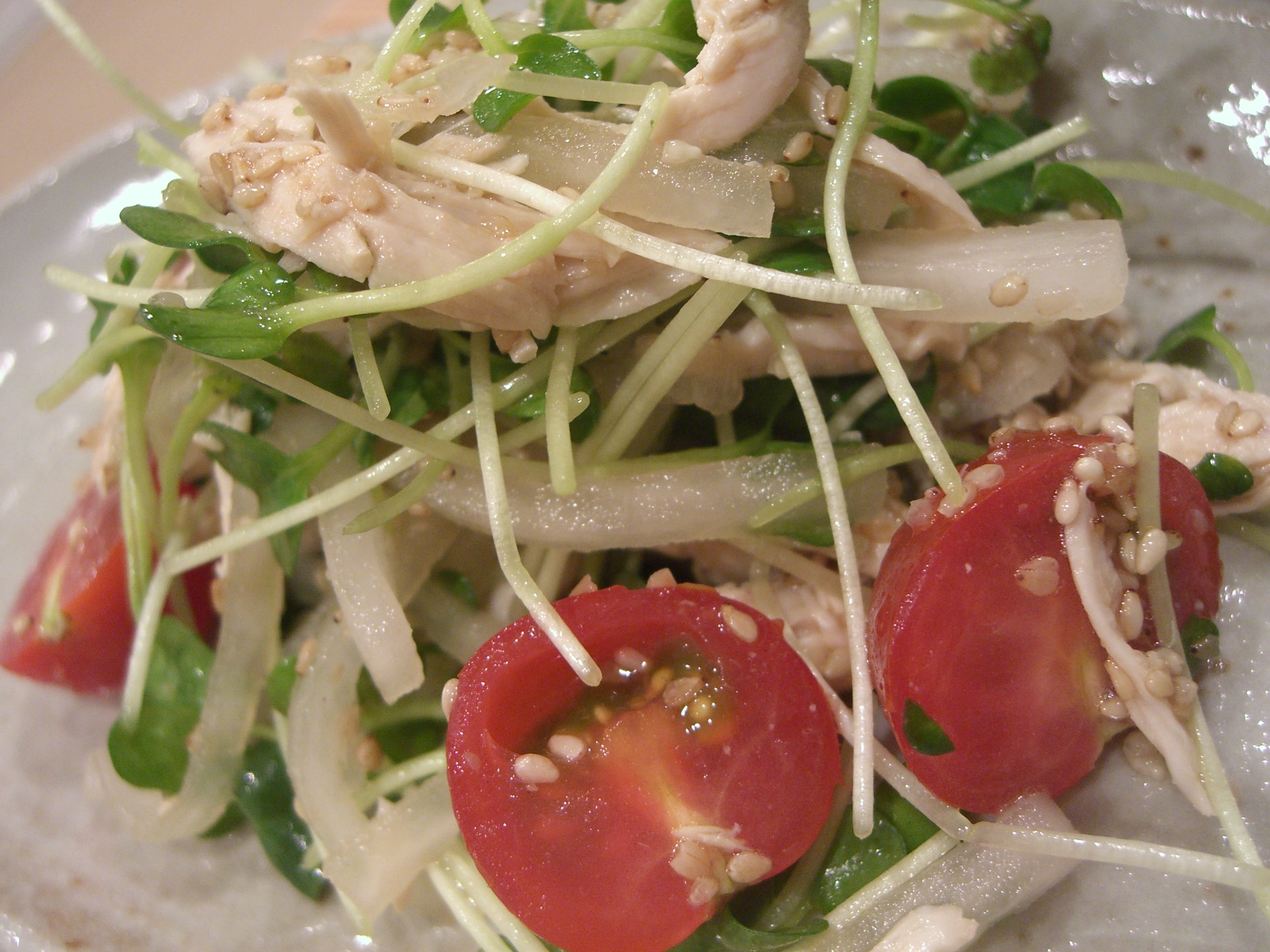 鶏のささ身、ダイコン・カイワレ・トマトのサラダ。