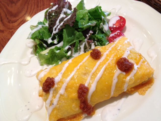 スパイシーチキンとたっぷりの野菜、チーズリゾットをトルティーヤで巻いて、
