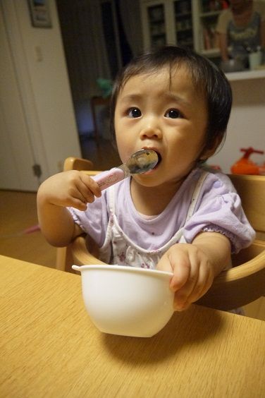 1歳になり、ご飯もスプーンで食べられるようになったことちゃんです。