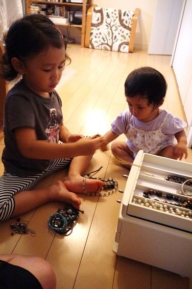まずは、おばあちゃんのアクセサリー入れから、出したり入れたり。