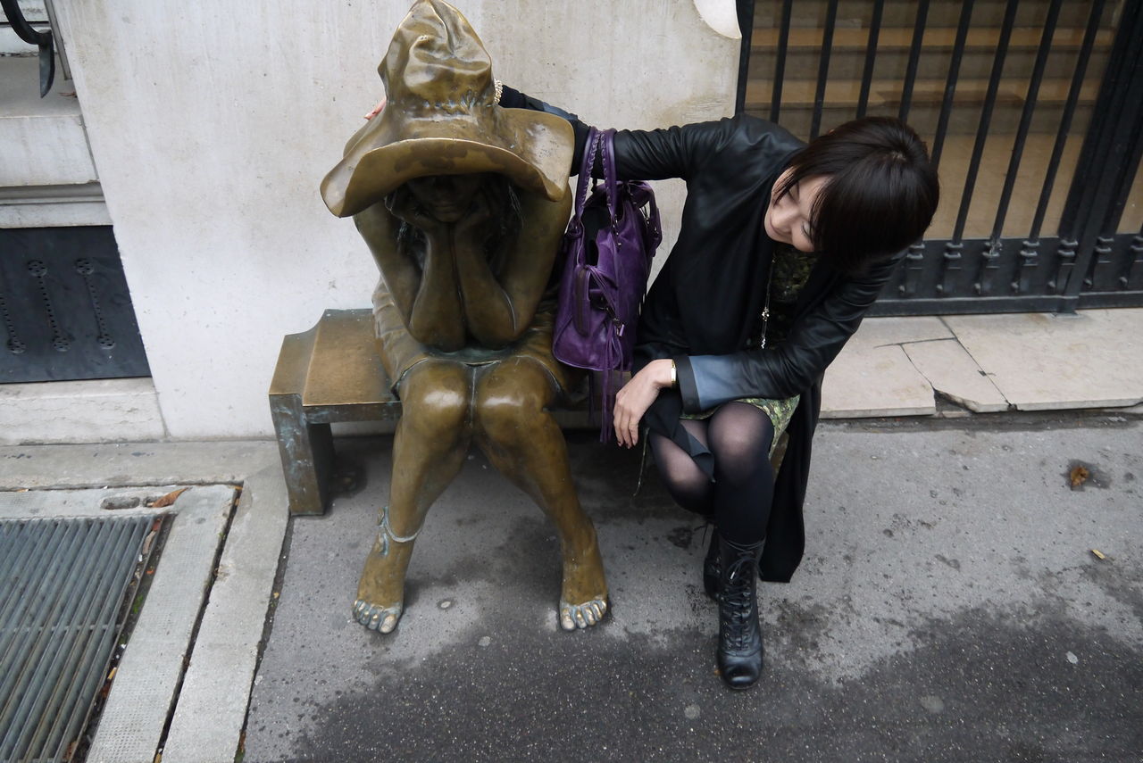 ある大使館の前で、帽子をかぶった女性が悲しくうつむいている像がありました。