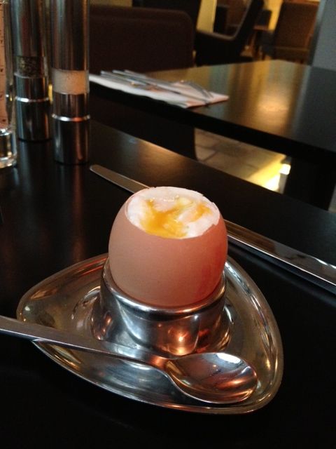 ボイルドエッグを頼んだら、こんな形でサーブされました! 上の部分だけカットされているので、温泉卵くらいの柔らか仕上げでも、食べやすいです。日本の温泉街で、温泉卵をこんな形でだされてみたいです。