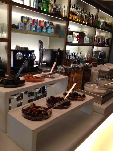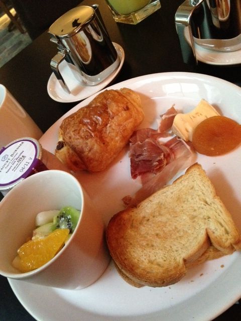 ホテルのモーニングへ。夜は、barになるという場所で、温かみのあるソファーと間接照明の効果で、朝からホットする空間でした。チーズや生ハム、オシャレなヨーグルトなど、典型的なモーニングに比べるとっても充実していました。