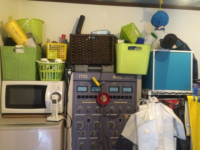 私は、たくさんのとりあえずBOXを棚から下ろして、中のものを全部出していく作業から始めました。現在も使っているものと明らかにわかるものは残して、「?」なものは、クライアントさんご自身に選択して頂いて。足の踏み場がないくらいに、物をまずは全部だしました。
