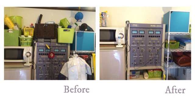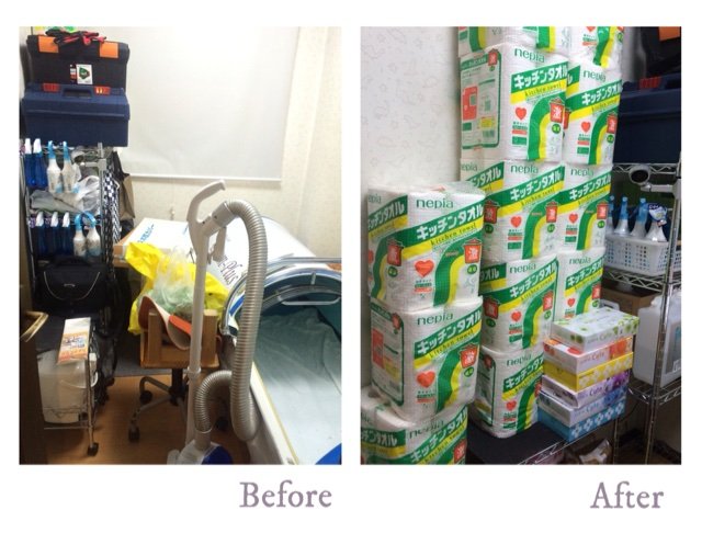 4時間後、かなりスッキリです。新しい収納ボックスなども買わずして、物を捨てて、スーパーのような美しい陳列をしただけで、見違えるものです。今回奇麗になったことで、また別の部分が見えてくると思います。後は、お客様が使うものに関して劣化が見られるものがあったので、新調したほうがいいと思います。
