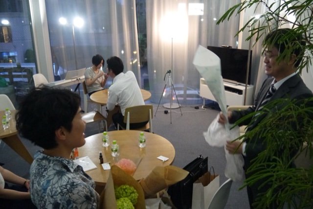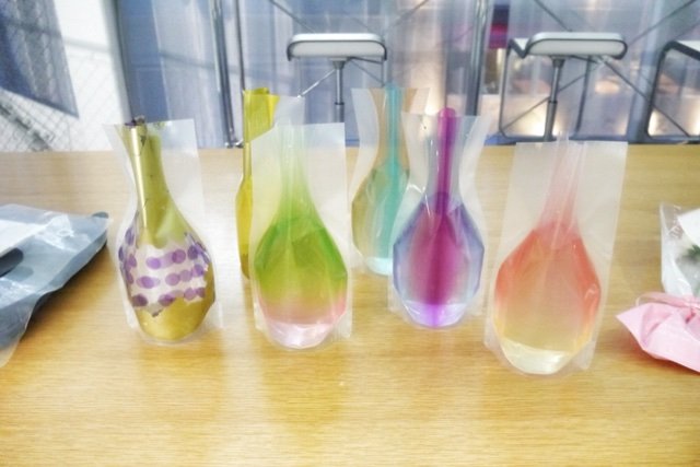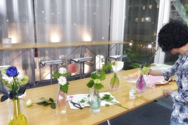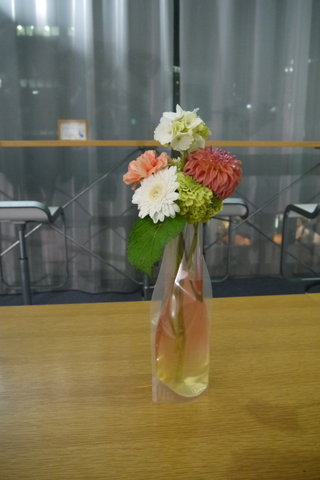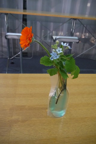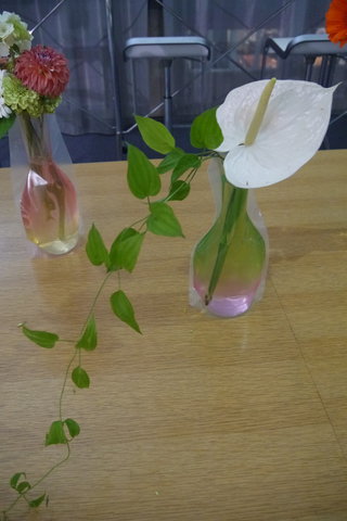 A子さんありがとうございました! 急にドレスコード『一輪の花』を思いつき、花生けを依頼しました。どんな花瓶にしたらいいか? 私も色々な可能性を考えて辿り着いたのが、ビニールの花瓶でした。どんな思いでそれぞれの参加者の方がお花を買ってくるか? とても楽しみにしていました。意外にも男性のほうが、個性的な花を選んだことは面白い発見でした。(笑)私が選んだカラーは、あまり目立たないと思っていたのに、メインの花として飾られていたことも、私の中の発想にはなかったです。創作が大成功して、10周年EVENTに文字通り花を添えていただけたこと、ありがとうございました!感動しました。