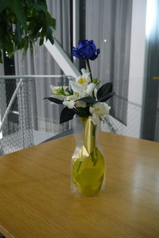 15本の花のために、スタイリッシュなビニールの花瓶をあらかじめ私が用意しておきました。