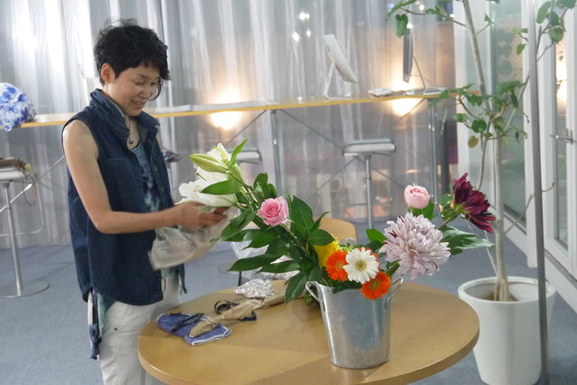 今回もドレスコードを指定しました。前回は、「お花一輪」としまして、「普段の日常」にお花を買うという体験をして頂く趣旨でした。それを華道の先生にアレンジしていただきました。