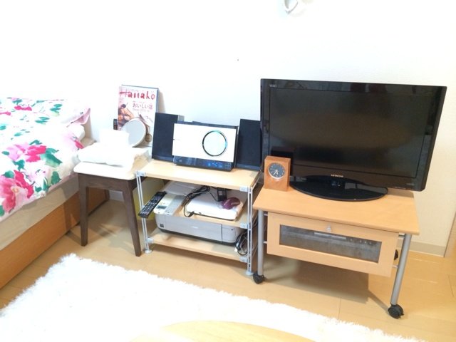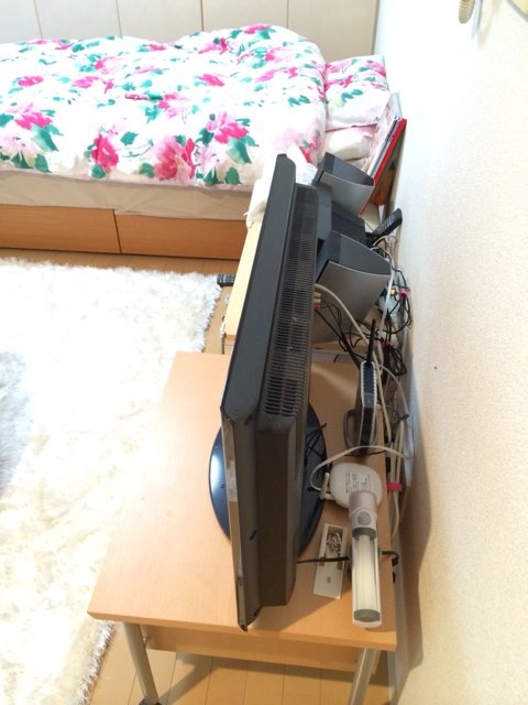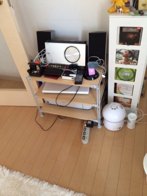 一見、奇麗に並べられた部屋ですが、カオス状態を発見!配線コードが気になりますね~。きっと、混線しているだろうと予測していたので、配線ベルトを100均で仕入れてきましたよ。