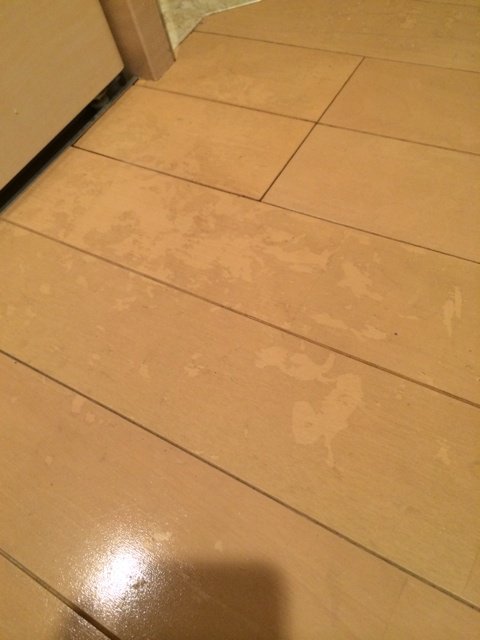 玄関のフローリングに、染みのような感じで付着しているものがありました。こちらも白スポンジで擦り倒します。雑巾だけでは、落ちないような汚れでしたが、白スポンジで見事クリアーに!