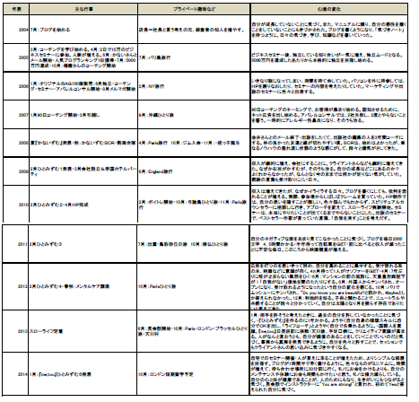 縦軸は年、横軸は主な出来事、趣味、心境の変化とし、独立した2006年の6月から始めようと思ったのですが、何だかしっくりこず、一番しっくりする年を頭に持ってこようと改めて考えたら、2004年7月、ちょうど10年前となりました。
