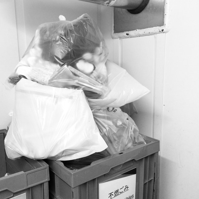 私のマンションは、各階にゴミ庫があり、毎日ゴミの回収があるので、好きなときに捨てることができます。捨て好きにとっては、好条件なのです。(↓ 私のごみ袋でいっぱい!)